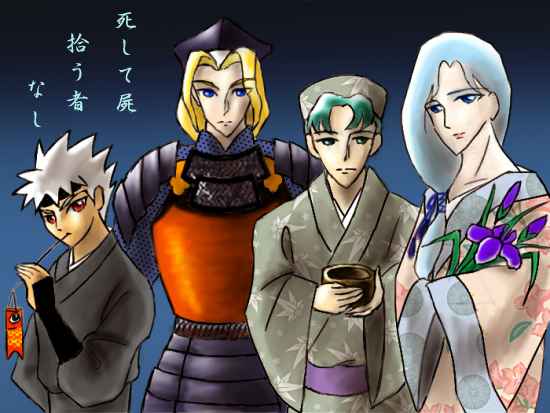 | 今回は光様、水様、鋼様、地様に絞らせていただきました。 一応、「節句を祝う守護聖様達」ということで鎧兜と和服を着せた、ほのぼの路線を考えていたのですが、 この4人の組み合わせは、ダークな時代劇が似合うと気がつきましてすっかり「大江戸捜査網」になってしまいました。(滝汗…) でも、実はノリノリで描いていまして、各人の設定まで考えてしまいました。(^^;) 「戦国武将と陰で支える忍衆」です。 光様は若き戦国武将。 小国の主ですが、並居る戦国大名に一歩も引けを取りません。 一見厳しいのですが、領民からはたいへん慕われています。 水様の表の顔は旅の一座の人気役者。 裏の顔は美貌の暗殺者。愛用する南蛮渡りの洋琴には短剣が仕込まれています。 本当は、誰よりも平和を願う彼の目はいつも悲しげです。 地様はおっとりした貿易商の若だんな。 しかし、彼の情報網は万の兵士に値します。光様がもっとも信頼する仲間です。 毒物のエキスパートでもあります。 鋼様は忍びです。 時々無鉄砲な行動をして光様から叱られますが、忍びの腕は一流です。 年上の仲間からも一目置かれています。特に地様から可愛がられています。 |
